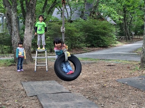 キャンプ場にハイジブランコとタイヤターザン(?)があって子供たちは楽しく遊んでたみたい。。。みたいというのは・・・そうほったらかしの親でごめんなさい。。。キャンプ場では結構ほったらかしです。。遠くから時々tomoさんが明子姉さん(巨人の星)のごとく木の陰から見守ってますが・・・知らない子と仲良くなって遊んでます。。tomoさんにも私にもない、chumの能力だれとで~も仲間になって♪ ともだちに~なろお~年下・年上関係なく友達作って遊んでます。。。誰に似たんだろうね~sinちゃんのお友達ファミリーのdaiちゃんとsuuちゃんとすっかり仲良くなった子供たち。。。kanは怖いもの知らずなのであっさりできるように。。。daiちゃんに支えてもらってあああ~~~~~~~~~。。。明子姉さん(tomo)いわくchumは一人だけできなくて、イジケてどこかに走り去ったと・・・・その後、daiちゃんに助けてもらい無事できるようになったもよう。。。ドヤ顔です。。。仲良くなったと思ったらすぐケンカをして帰ってくる。。。子供ってすごいな~短期間でケンカができるほど仲良くなれるんだから・・・仲直りのサクサクパンダをみんなでパクリ!大家族でキャンプって楽しいね~またできるといいな~大家族キャンプ