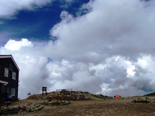 10:56 胸突八丁到着!!(前回の到着は12:04!)休むことなく登ります!!2年前のtomoさんの滑落現場!今は進入禁止になってました。。。他にも落ちた人がいたのかしらナデシコかなと思ったらセンジュガンピという花だそうです。オオバギボウシ下をのぞくと結構な高さ・・・ヒヤッ写真を撮り忘れましたが、最終水場が2年前とは違うところに口があった気がする・・・。前は湧水っぽかったのですが、今は沢の水をそのままひいてる感じ・・・・汲んでみましたが、雨のせいか浮遊物が・・・・今回は常念小屋で水を買うことにしました。。(1L/\200)胸突八丁から超鈍足で登ること1時間やっと常念岳が見えてきました~13:00 常念小屋到着~~~~今回の所要時間約6時間前回の8時間を大きく上回った~~~~~成長したよ~テン場は空いていて選びたい放題ただ明日はヘリが来て荷揚げをするので8時までに撤収してとのことでした。。。常念の頂上がなかなか顔を出してくれない。。。槍ヶ岳も穂高も雲の中~~~~設営して遅めのお昼ご飯。。。そして昼寝~~~って起きて見たら出た~~~~~~~~!!!晴れてて常念岳全体が見える~~~でももうこれから登る気力も時間もないので、明日晴れることを願ってビールで乾杯!テン場近くに咲いていたのはミヤマコゴメグサつづく