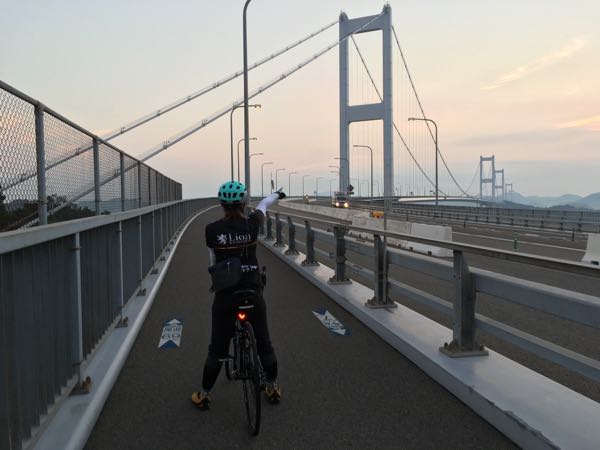 愛媛県今治市に1泊した翌日は今治側から早朝ライド 朝5:30 来島海峡大橋を渡ります。 朝日よ出でよ〜〜〜〜🙌 出てきた! 出てきた出てきた! 出た〜〜♬ 振り返るとまだ月が、、、 朝日に照らされて朝靄の島々が綺麗 夕焼けみたいだけど、朝焼け✨