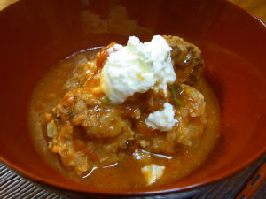 今夜はウクライナのバレエ学校の先生に教えていただいた”ティエフティエリ”を作ってみました♪ <材料>豚ミンチ 300gごはん 2合卵 1ヶ小麦粉 少々片栗粉 少々玉ねぎ 中1個(みじん切り)人参 中1本(みじん切り)ピーマン 中2個(細かく)カットトマト缶 1缶コンソメ 2キューブ塩 適宜コショウ 適宜ナツメグ 適宜 <作り方>1)玉ねぎ、人参はフードプロセッサーでみじん切りに。ピーマンは細かく刻む2)豚ミンチを粘りが出るまでこねる。そこに塩、ナツメグ、こしょうを加える。3)2)に卵、野菜を入れて、さらに混ぜる。4)3)に小麦粉と片栗粉を入れて混ぜる。5)4)をボール状に固める。6)鍋に水、コンソメ、カットトマトを入れて煮る。7)6)に4)を入れて煮る。8)ミンチボールが煮えたら、出来上がり♪サワークリームをのせていただきました~とってもおいしくできましたよ。おまけにおなかがしっかり満たされるのです。次男も長女も大満足。パパはまだ帰って来ていないので食べていませんがこれなら、合格間違いなしです!!今度は長男がいるときに作ろうと思います♪材料の半分のボールははあらかじめ、サラダオイルで揚げてからスープの中に入れてみました。こちらも美味でした♪