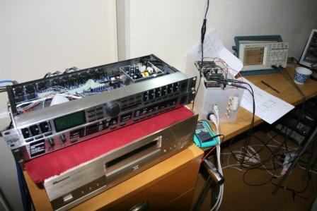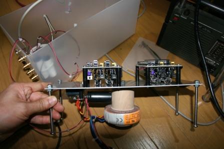 ということで、前回のつづきです。このプロジェクトが終わるまで、マニアックな話題で申し訳ないです。自分にプレッシャーを掛けないと、なんにも先に進まないですから。。http://plaza.rakuten.co.jp/mabo400dc/diary/201002220000/BEHRINGER ベリンガー DCX2496 24‐bit/96kHz チャンネル・ディバイダー(クロスオーバー)ベーリンガーのデジタル・チャンネル・デバイダーDCX2496の音が悪いわけは、アナログ出力のローパス・フィルターにオペアンプ4580を使っているからだ。しかし、このオペアンプは8ピンSSOPというフラットな小型のICで、両面スルーホール基盤に実装されているので、回路解析も改造も困難です。改造は諦めて、DAC(デジタル・アナログ・コンバーター)以降を自作することに決めていましたが、前回はDCX2496にS/PDIF出力(ふつうのデジタル出力)端子を増設することにしていました。しかし、どうせ自分だけしか使わないので、S/PDIFは使わないことにしました。面倒だしお金もかかる、その割には報われない。。S/PDIFはPLL技術を使って送り出し側の信号に受ける側の基準信号を同期させるので、出力信号がふらつけば、受ける方の基準信号もふらつきます。原理的に低ジッター(位相雑音)化が困難なのです。実際にいろいろやってみても、S/PDIFを使わず、直結の方が音が良いのです。CDプレーヤなどのデジタル/アナログ信号変換で遊んでいると、デジタルはON/OFF、0/1しかないので、変換時の曖昧さはないものと思われるかもしれませんが、とんでもない。ジッター(位相雑音)と呼ばれるデジタル信号の横揺れ(fs±α)のαがアナログにも変換されるし、基準クロックに含まれていれば、アナログからデジタルへの変換タイミングの誤差となって最後までつきまとう。実はアナログとデジタルの境界というのは、皆さんが単純に思われる程は明確ではないのだ。さて直結となると、BCK、LRCK、SDATAの3本線での出力が必要になります。今回は安直に9ピンのD-SUBケーブルを使い、BCK、LRCK、の他にSDATAが3組(ステレオ3Way対応だから)、グランドを合わせて、6本のケーブルをDCX2496の本体から外部に引き出すことにして、今日はその作業をしました。一番神経を使ったのが、DACの入力から先の3種類の信号を分岐するために、ケーブルをハンダ付けするところでした。DACのAK4393VFは28ピンのVSOP(お酒ではない、SSOPの半分程しかない大きさ)、ピン幅が0.22mm、ピン間隔は0.65mm、ケーブルの直径は0.26mmと非常に小さく、人間技でハンダ付けのできるぎりぎりの大きさです。なんとかクリアして、9ピンのD-SUBコネクターの後ろに74HC14というシュミット・トリガー・インバータというICで先程のデジタル信号を受けて送り出す回路をコネクターのピンに直接組み込みました。このICはDIPなので、空中配線でも楽勝です。D-SUBコネクターはあらかじめケースに穴を開けて取り付けておきます。慎重にハンダが隣のピンに接触していないか確認後、電源を入れ、オシロスコープで信号をチェックしてOK!基準信号を作っている水晶発振子も安物なので、ヤフオクでゲットしておいたOCXO(恒温槽入り)に交換しようと思っていましたが、両面スルーホール基盤が解析できずにあっさり断念しました^^基盤や電源トランスはアルミの板に取り付け、φ6mm、長さ90mmのネジで足を作り、半透明のCD収納ケースに収める予定。超手抜き、、静電シールドもあったもんではないのですが、たぶん問題ないでしょう。。^^音が良さそうなら、ちゃんとした金属ケースに収めます。金属ケースはお高いし、穴開けなどの加工がしんどい。。
