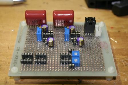最大値測定回路基板です。大きな部品配置と電源ラインの配線が終わったところ。理想ダイオード回路で両波整流して0.2sのピークホールド回路を通して出力します。表裏3種類の基板。スピーカの設計にはこれだけ必要です。左から「ボイスコイル熱時定数シミュレータ基板(RMS/DC変換回路>10s長時間時定数回路>理想ダイオードによる半波整流回路)」この基盤は熱時定数10sの他に3s、1sの合計3枚必要、中央「振動板最大振幅測定回路基板(2回積分回路>理想ダイオード回路による両波整流回路>0.2sピークホールド回路)」、右「最大振幅測定回路基板」、