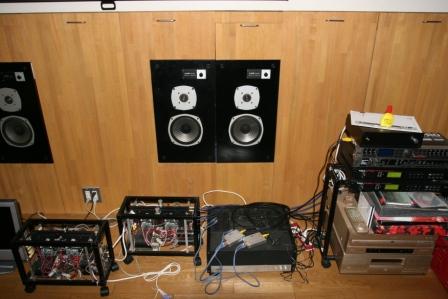 以前は会議室の壁にHS-10000と並べて試聴していたのですが、母屋に引っ越してきました。低音以外はHS-10000と変わりません。むしろくっきりと明瞭な音です。それには理由があるのですが、後ほど説明します。これからはYAMAHA B-Iによる定電圧ドライブのオリジナルHS-400と並べて試聴することにしました。定電流駆動というのは、分かり易く言えばDF(ダンピングファクター):0でのスピーカードライブ方式です。したがってfoでの速度帰還が掛かりませんので、foでのインピーダンスカーブそのままの音圧になります。このピークをコントロールする必要がありますので、マルチアンプにする必要があります。それはまた次回にでもご紹介することとして、ではなぜ定電流駆動なのかというと、スピーカー駆動力というのはF=BLI (B:磁束密度、L:磁束中の電線の長さ、I:Lを流れる電流)ですので、スピーカインピーダンスRの関数ではないのですが、電圧で駆動するとI=V/Rとなり、与式に代入すると、F=BLV/Rとなり、熱時定数や高域のL成分を持つやくざなR(スピーカーケーブル含む)が駆動力の式に変数として入ってしまうのです。ということは、大信号で大電流が流れるとボイスコイルの温度が上昇し、インピーダンスは過渡的に上昇するので、電流Iは下がり駆動力が落ちるという悪循環に陥ります。定電流駆動はこのような現象を音に表さないスピーカーの理想的な駆動方法なのです。定電流駆動すると、くっきりはっきり、目が覚めるような音になります。と同時にスピーカー本来の粗も見えてきてしまうかもしれません。マルチアンプ駆動なので、それぞれのスピーカーにケーブルを直結します。MH-35にケーブル直付け。L-205にも直付け。ケーブルは裏から出す。壁(平面バッフル)に納める。実は今回急遽HS-400の定電流駆動試聴環境を整えたのは、世界で2台しかない2台目の定電流アンプが整備修理のために戻って来たからです。各々、100W、出力インピーダンス100kΩの定電流駆動アンプ4台入り。