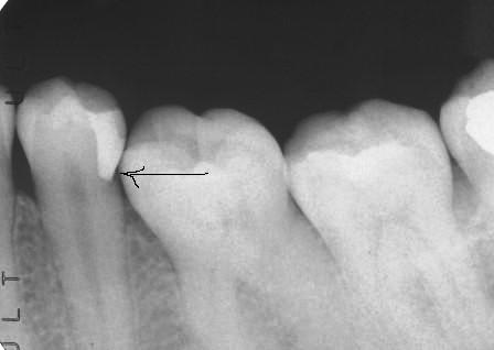 30代男性、左下5。後ろの6番が5番のデントエナメル境に食い込む形になっていて、歯根部の象牙質だけがムシ歯になる症例です。よく見かけますが、歯科医学的には原因はよく解っていません。しかし電気化学的には説明が簡単な症例です。まず、6番のエナメル質と5番の象牙質ではイオン化傾向を調べると象牙質の方がわずかながら大きい。また、この部分は狭い隙間になっているので、相対的に酸素濃度が低い。もちろん歯間部は細菌のすみかになっているので、細菌の代謝産物により低pHとなっており局部電池を形成しやすい。この局部電池のアノードとなるのが相対的にイオンが傾向が大きい5番の象牙質で、電子を奪われる側なので腐食してムシ歯になる。・・10年程前、CR充填に取り組み始めた頃の症例で、レントゲンで見るとなんとなく充填がショートになっているように見えて気になっていました。気になっていた6年前と5年前のレントゲン写真です。これが今回のレントゲン写真です。えらく解像度が悪いですね。某○ダックですが、フィルムの性能が落ちているのでしょうか?銀塩は絶滅間近なのでしょうか?メーカーは変わっていないと言っているようですが。。この度、トンネリング形成の時、残している遠心の辺縁隆線がチッピングしたので、再治療の機会に恵まれました。CRを除去していくとα-TCPセメントは使っていないことが分かります。歯肉縁下のマージンはやや軟化象牙質化していましたが、危惧していた程には悪くなっていませんでした。10年前に取り残していた軟化象牙質なのか、その後にできた軟化象牙質なのか、未だに判断できずに考え中です。α-TCPセメントを使って再充填して終わりました。