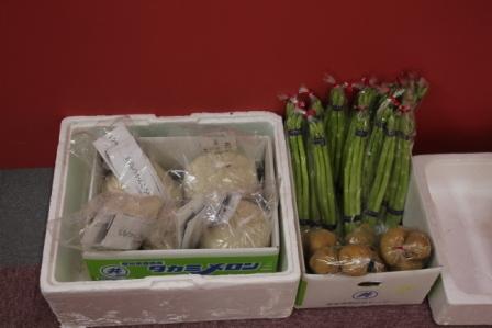 アスパラとジャガイモは100円。かんころ粉は1kg500円、サツマイモをスライスして天日乾燥後粉に挽いたもので、餅(団子?)にします。レシピ付き。
