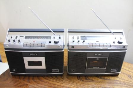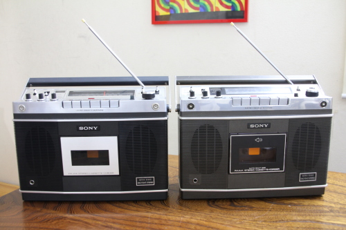 クリックで拡大します。向って左が1971年製TC-2500 45,800円、右が1972年製TC-2550 46,800円、SONYの最初期のステレオラジカセです。カセット蓋のアルミ化粧板が無くなっている、全体の色が多少変わっている、内蔵マイクの色も、ツマミの上部のアルミ化粧板が付いた、くらいのマイナーチェンジですが、1年で1,000円値上がりしています。ぼくは初代TC-2500の方がよいと思います。高度経済成長期というのは驚く程物価が上がり続けていました。今の中国と同じです。それは、いくらでも需要があった、いくらでも人々の欲望が肥大していったからで、今、物価が上がっても生活が苦しくなるだけで終わるでしょう。