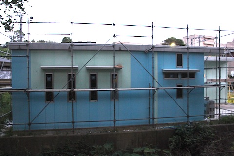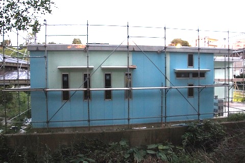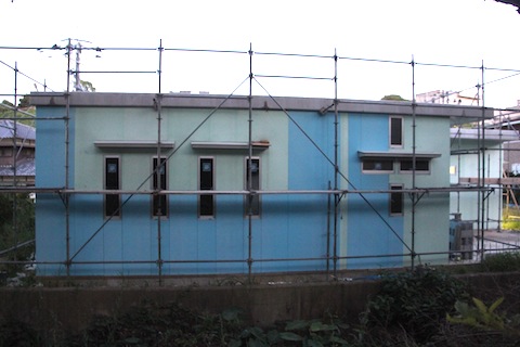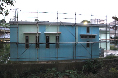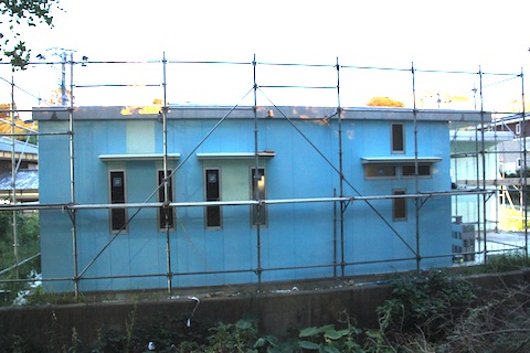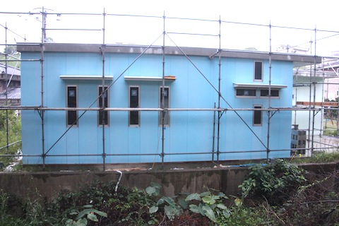 今日は終日雨でしたが、水路側は終わりました。というか、カットし終わりました。まだ貼っていません。でも、まあ、終わりました。あとは、向って右端にちょっと見えるカーポートの1面を貼れば外装板貼付け作業は終わりです。窓が1つだけですので、1日で終わるでしょう。その後は目地をシリコンで埋めて、角にはLアングルを貼って仕上げます。外装が終われば、壁に太陽熱温水器からガス給湯器への配管を埋め込んだり、吸排気用のダクトのガラリの取り付などの細々した作業をして、屋根にアルミの防水・遮熱シートを貼る作業に入ります。これが終われば、ソーラー関連の部品を屋根の上に運んで、足場を取払い、いよいよドアの取り付け作業、床、内装へと進みます。