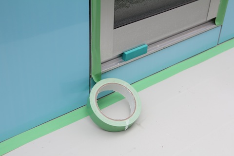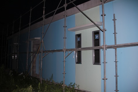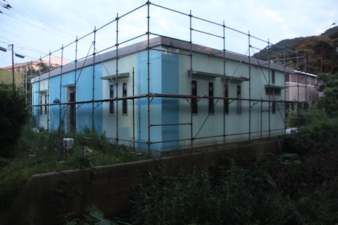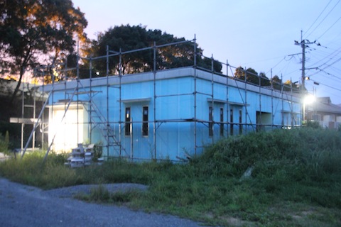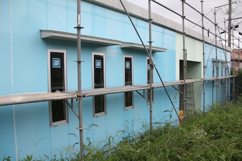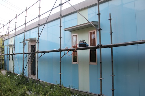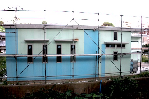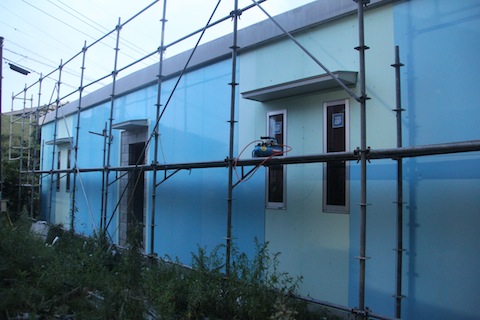 今日の診療の合間に、とは言ってもやはり3時間はしましたが、とりあえず、外装板貼りは終わって、足場がないと難しい高所の吸排気のガラリ取り付けの穴を開けたり、配管配線の準備をしたりしました。明日の午後から台風に伴う雨ということなので、明日の午前中に目地をシリコンで埋める作業を終わらせたいのですが、どうでしょうか?間に合いますかね?養生テープは25mm×25mを5本買いました。