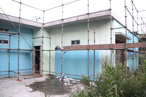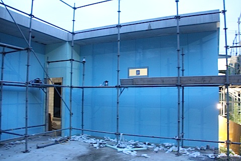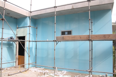今日の診療の合間に向って右側の3枚貼りました、30cm幅ですが。この部分は太陽熱温水器のお湯を追い炊きするガス給湯器を通すための配管を断熱材の中に埋め込んで、外部からは見えないようにしようと思っていますので、外装板を外せるようにデザインするつもりです。