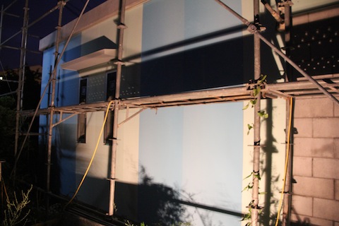 パネルの目地(つなぎ目)を埋めるには、まず、マスキングテープでシリコンがはみ出ても良いようにします。で、シリコンを充填して、指でトリミングして、固まるのを待ちます。それだけ。吸排気のガラリ周りは養生シートを剥がしました。出来上がりはこんな感じです。目地を埋めて、シリコンが硬化したら養生シートを剥がしますが、近くで見るときたないですね。。今日は全部目地埋めを終わろうと思ったのですが、結局半分しかできませんでした。でもあと一日で外装は終わります。下半分が目地埋め完了、上半分はこれからです。見えますか?