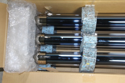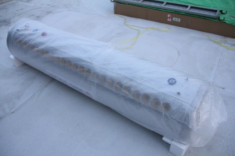 今日は足場があるうちに屋上に運べるように太陽熱温水器MMSシリーズの200Lを発注していたのですが、それが届きました。真空管式で、ちゃんとゲッターがあります。割れると白くなるはずです。コミコミで18万円程のお値段。反対側はヒートパイプ方式とかで銅製のパイプが突っ込んであります。昔のLUXMANのアンプの放熱器を思い出してしまいます。このおかげで水道直圧方式にできるのです。長さは2m程あって、これが24本あります。割らずに屋上に運べるかどうか心配^^;;これはお湯を溜める200Lのタンクです。お天気が悪いときのために追い炊き用ガス給湯器も買いました。コミコミ25000円