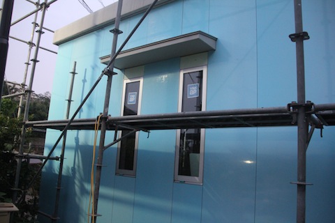 今日も診療の合間に、と言っても4時間はしましたが、前回のつづきの水路側のカット済みのパネルを防水両面テープで貼る作業を終わり、カーポート側の1面の作業に入りました。この面が終われば外装板貼りは全て終わります。とりあえず、カットが必要の無い4枚を貼りました。水が溜まっていましたので、テッシュで拭いたり、エアーガンで乾燥させたりしながらの作業でした。