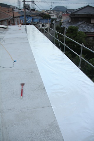 今日は設計担当の建築士U本さんが、応援に駆けつけてきてくれたので、一人ではできないソーラー温水器、PV関連のパーツやエアコンの室外機などを屋根の上に挙げる作業をしました。それと屋根の防水、遮熱を兼ねる「サーモバリア スリム」というアルミ複合シートを貼る作業をしてみました。このシートは1200mm幅ですが、いつものアクリル系防水両面テープ3条で貼っています。建築士のU本さんの上手いこと上手いこと、、「展示パネルのシート(?)貼りを昔やっていたので、その応用。」と言っていましたが、上手でした。風があると、一人では無理かと思います。と言っても、するしかありませんが。。