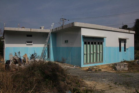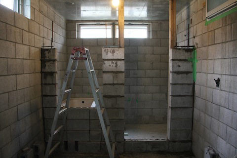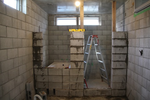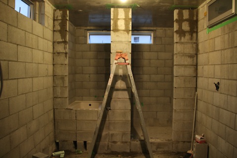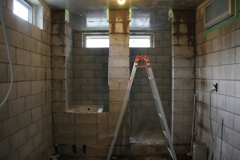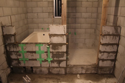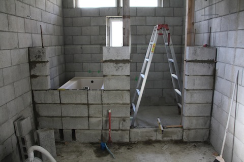 今日は午前中はツリーハウスの竣工式でつぶれたので、午後は夜8時まで、ブロック積みの現場作業をしていました。4段目までのブロック内部にゆるめのモルタルを流し込み、6段目までブロックを積み上げました。後7段あります。ブロックは本職のようには上手く積めないので、スペーサー工法を採りました。素人でも速く正確に積めますが、スペーサー部分は後で補修が必要です。お風呂から洗面所方向