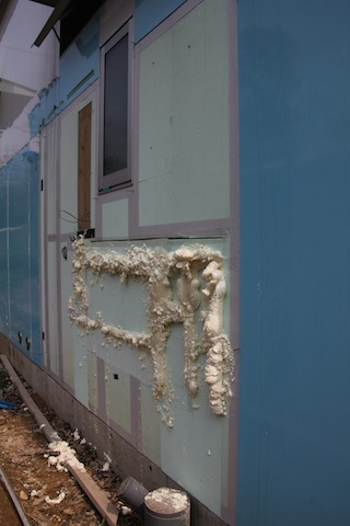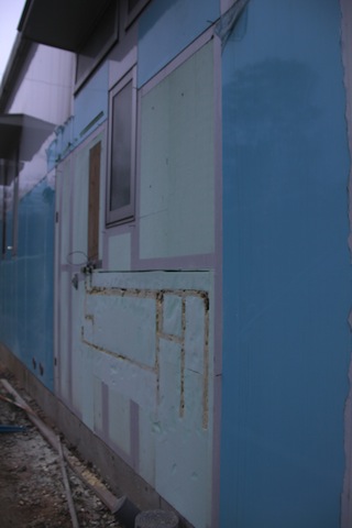 今日はお風呂の壁の仕上げをしました。10日程養生して、ドアと採光用FIX窓を取り付ける予定。その間、お風呂の排水系の配管をして床を作ります。通風用窓は玄関ホールに2枚、歯医者スペースに1枚設置しました。窓はこれで終わり。給湯器周りの配管を断熱材で覆いました。すき間に発泡ウレタンを充填して、外装板を貼る予定。