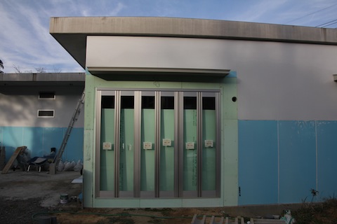 今日は大開口部の折れ戸周りの外装板を貼り終わり、目地埋めとライトの取り付けまでしましたので、とても疲れました。本業の技工もあるのですが、ちょっと無理そうです^^;;
