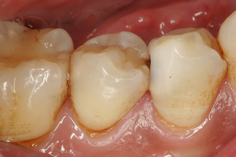 70代女性、右上6ハイブリッドクラウン再製作。ハイブリッドのインレー・クラウンは丈夫ではない、特に引張り強度が良くないので、咬合力で破折しやすいです。CAD/CAMで作るハイブリッドクラウンが保険導入されましたが、クレームの嵐になるでしょう。内部に強化繊維を入れると、破折はし難くなりますが、今度はダツリに気が付かず、ひどい虫歯になることがあります。元々メタルをハイブリに置き換える発想に無理があるのでしょう。それなりの窩洞形成をしたCR充填の方が保ちます。ハイブリとCRは基本的に同じものではあるのですが。この症例は10年経過していて、よく持ちこたえた方ですが、ボロボロです。正像ついでに後ろのメタルインレーと手前側のWSDをCR充填しました。作るのならメタルの裏打ちのある前装冠にすると長持ちします。出来上がり