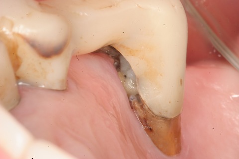 80代女性、左上6、歯根分岐部の歯根面カリエスによる歯根分離。最近こういう症例が多いように思います。歯周病の長期管理をしているとどうしても歯根分岐部より歯槽骨が下がってしまった症例も手がけますので、仕方がありません。他にも何症例かアップしようと思っています。痛みはないものの、DH(デンタルハイジニスト:歯科衛生士)が歯根分岐部に食渣がたまって、虫歯になっているようだと報告があった症例です。ちょっと開けてみましたが、歯根分岐部内部は広範囲な虫歯になっています。分岐部は酸素濃度が相対的に低いので、酸素濃度差腐食が起こりやすい環境です。もちろん食渣は溜まるので、発酵による酸性環境ですから、電気化学的な腐食を止める事は難しいのです。口蓋根はすでに抜けていました。頬側根の内側だけをCR充填して、とりあえず抜歯は先送りです。