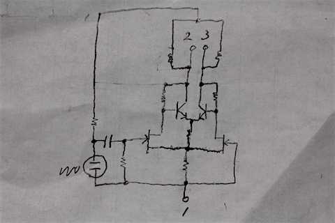 あれからマイクプリアンプの回路を考えていたのだが、正極電圧が出力に合わせて変動するのが気持ち悪い。正極電圧と感度の関係は少ないので、ま、いいか、と思ったが、差動アンプの動作に影響の少ない高抵抗で逆位相で振れる2 、3端子を繋いで正極電圧を作れば良いかと考えたのが改良点。バイポーラTr.の共通エミッターに抵抗を入れて、両コレクター電流をコントロールしやすく、かつFETの動作電圧を高くしたのが改良点の2つ目。FETはIdssで動作して、残りの電流がバイポーラTr.に流れるという調整をする。歪率を改善するためにソースやエミッターに電流帰還抵抗を入れても良いかもしれない。FETはCissが小さく、ノイズの少ないものを選ぶと良い。2SK19*とか今でもあるのかな。。?