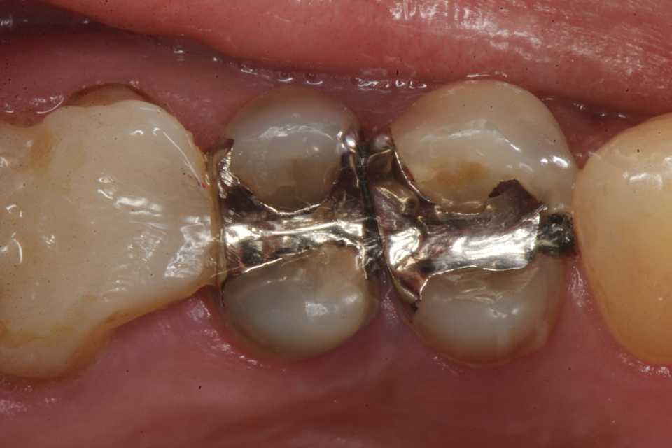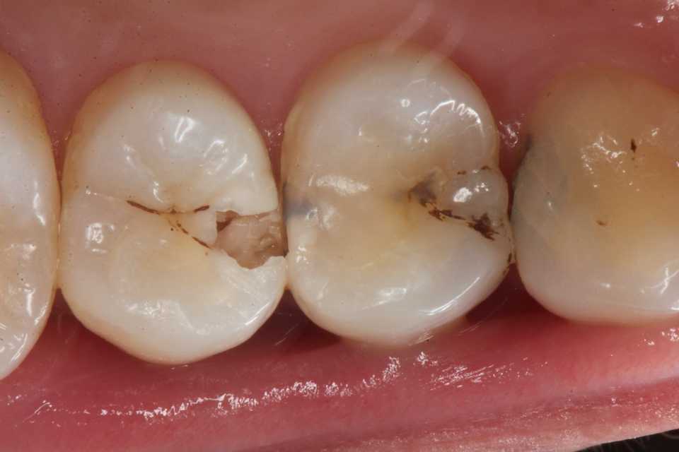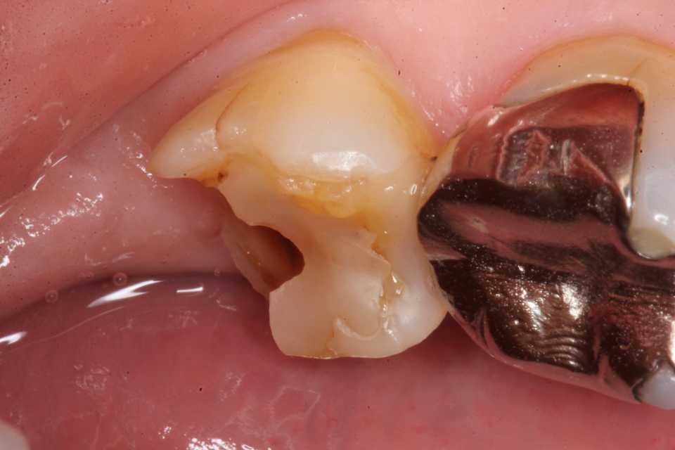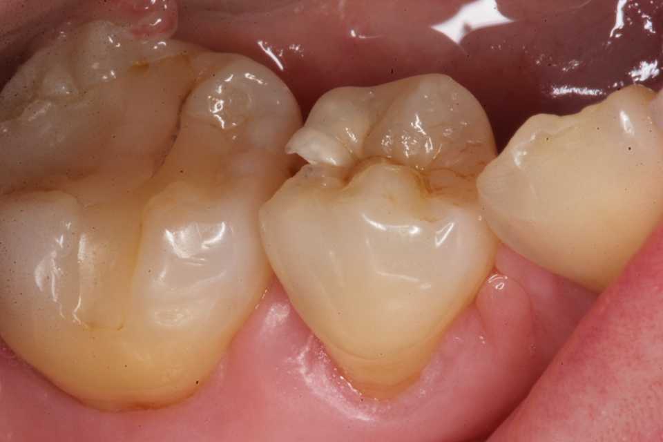 40代女性、左下5、隣接面カリエス。遠心(後方)が虫歯になりやすいのは、奥ほど酸素濃度が低いので、酸素濃度差電池を形成して電気的腐食を招きやすいからだ。虫歯は歯質(ハイドロキシアパタイト)の電気的腐食(金属のサビと同じ)なのだが、まだ知られていない。意外に虫歯が大きく、象牙質はほとんど失われていたので、薄くなったエナメル質が欠けてしまった。通常は歯髄の保存は難しいのだが、3MIX+α-TCP+CRのボンディングシステムを使えばなんとか歯髄を残すことができる。隣接面のCR充填はストリップス(隔壁)を使わないと無理とされているができないことはない。というかこの方が早く綺麗にできる。僕が使っているボンディング材はこちら。α-TCPに3MIXを耳かき一杯添加し、50%クエン酸で練る。この上からCRダイレクトボンディングでカバーする。3MIXの作り方はこちら。α-TCPの入手法はこちらでは時系列でどうぞ