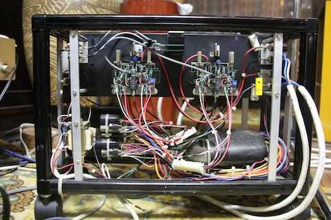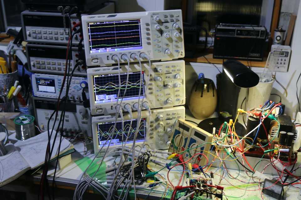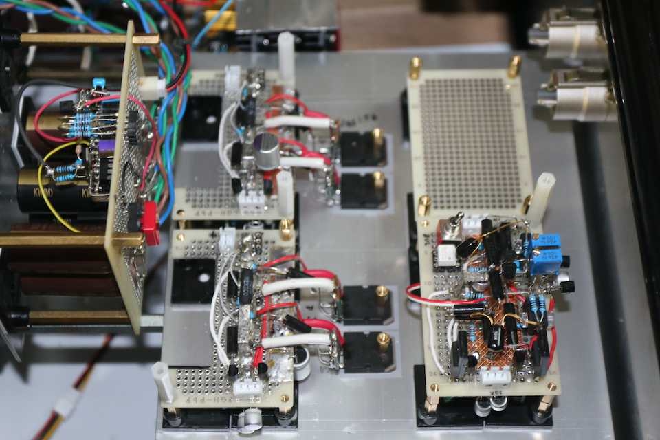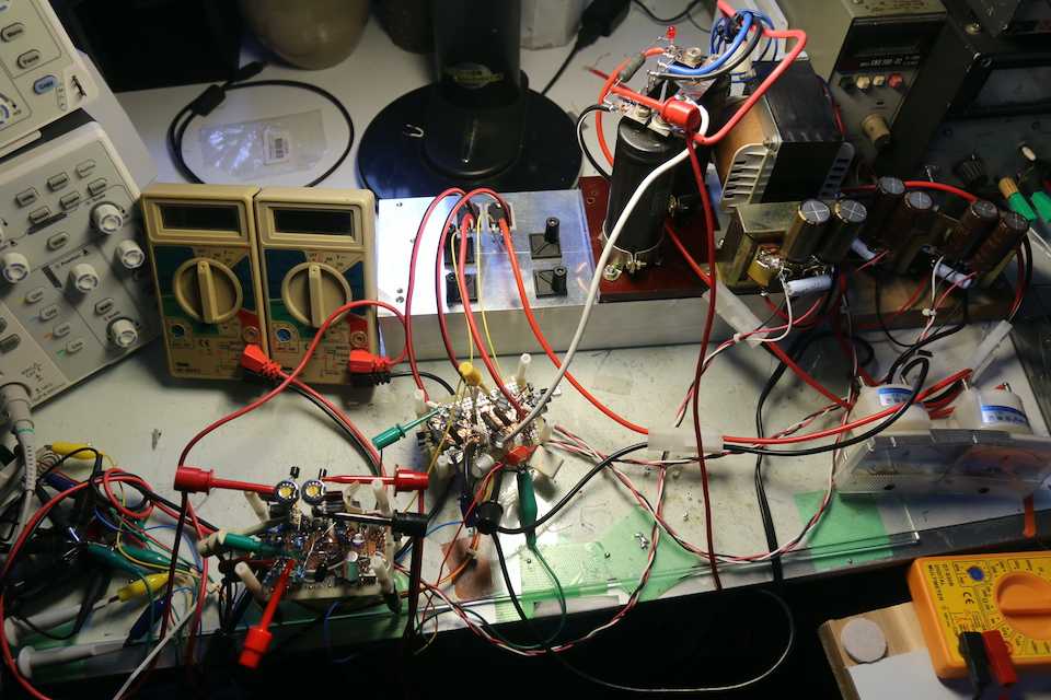 初段+ドライバー基板とファイナル基板が2つできたので、これから基板間の結線をしていよいよトータルでの動作確認作業。初めての回路なのでドキドキ、、w出力とグランドラインが残っている配線は片チャンネルだけ終わったけれど、どうだろう。。むずかしい過ぎるかも。。これから保護回路の配線と入力部分の配線後、火を入れようと思っているのだが、不安。。wスライダックで徐々に電圧を上げていったが、マイナス側の電流が大きかったので、調整しようとしていたら発振したかと思ったら、突然電流が流れなくなった。多分保護回路のMOS-FETが飛んだのだと思う。さてどうしようか。。前途多難。飛んだMOS-FETをバイパスして、電源を入れてみたが、寄生発振しているが信号は正常に出ている。ま、壊れていないということは分かった。実験機では寄生発振は出なかったのだが。。マイナス側に寄生発振が出ているので、マイナス側に位相補正をかけた。今のところ収まっている。実験機ではこうではなかったのだが、構造(コンストラクション)の問題は一筋縄ではいかない。飛んだMOSをパラにして放熱器も付ける必要性があるようだ。また時間の経過と共にクロスオーバー歪みが減る現象もある。徐々にアイドリング電流が増えて安定化するというだけには見えない。