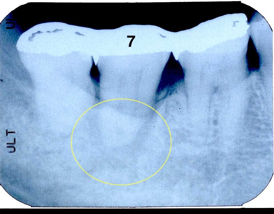 70代女性、右下7、咬合性外傷による歯髄壊死、自発痛+レントゲン写真を見ると根尖付近の陰影が強いので歯髄は壊死している可能性が高いことがわかる。このような症例は5分で終わることができて、しかも予後が極めて良い伝説の根管治療法を無料で完全公開しておきます。とりあえずインレーを除去して天蓋も除去して歯髄を見てみることにした。超音波スケーラーのエンドチップ#20 21mmで根管を洗浄。根管内の有機質を除去しようとか根管開拡しようとか、無駄どころか感染の機会を増やしてしまうことは一切必要ない。根管は水平エアブロウするだけで感染させるだけの乾燥工程は必要はない。1回目の3MIX+α-TCP精製水練りをディスポシリンジで充填し、エンドチップで押し込む。僕が使っているボンディング材はこちら。1回目のα-TCPは精製水練り。浸透性が良いが硬化が遅い3MIX+α-TCPを根管内に入れるだけで良い。緊密充填など考える必要はない。2回目はα-TCPの50%クエン酸練り(硬化する)。この上からCRダイレクトボンディングでカバーする。3MIXの作り方はこちら。α-TCPの入手法はこちら1回目2回目CRでカバーして終了。
