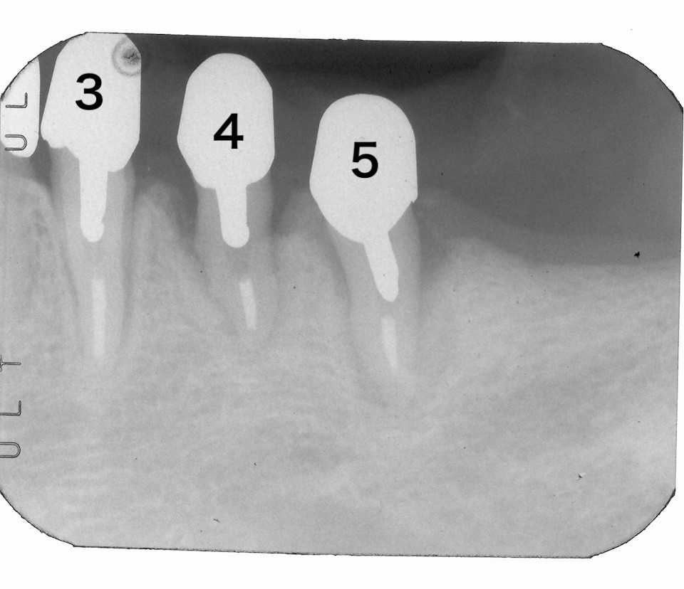 60代女性、左上4、GA(gingival abcess:歯肉膿瘍)この方も前医で抜くしかないと言われたとかで当院に来られた。抜くしかないとか、歯根破折?と思ったが、そうでもないらしい。レントゲン写真では歯根にクラックや穿孔がある可能性はあるが、側枝という可能性が大きいかもしれない。GAというよりはfistel(瘻孔)というべきか。とりあえず冠、メタルコア、根管充填材を除去してみることにした。冠除去メタルコア除去ピンクの根管充填材根管充填材除去根管長測定器では反応しない。根尖は閉じている、クラックや穿孔はない可能性が高い、小さな側枝はあるかもしれないが、不明。いずれにしろ3MIX+α-TCPの2回法で根管充填して経過観察。1回目のα-TCPは精製水練り。浸透性が良いが硬化が遅い3MIX+α-TCPを根管内に入れるだけで良い。緊密充填など考える必要はない。3MIXの作り方はこちら。α-TCPの入手法はこちら2回目は50%クエン酸水練り、硬化が速いので、このうえにCRでカバーできる。経過が良ければ歯を作る予定。