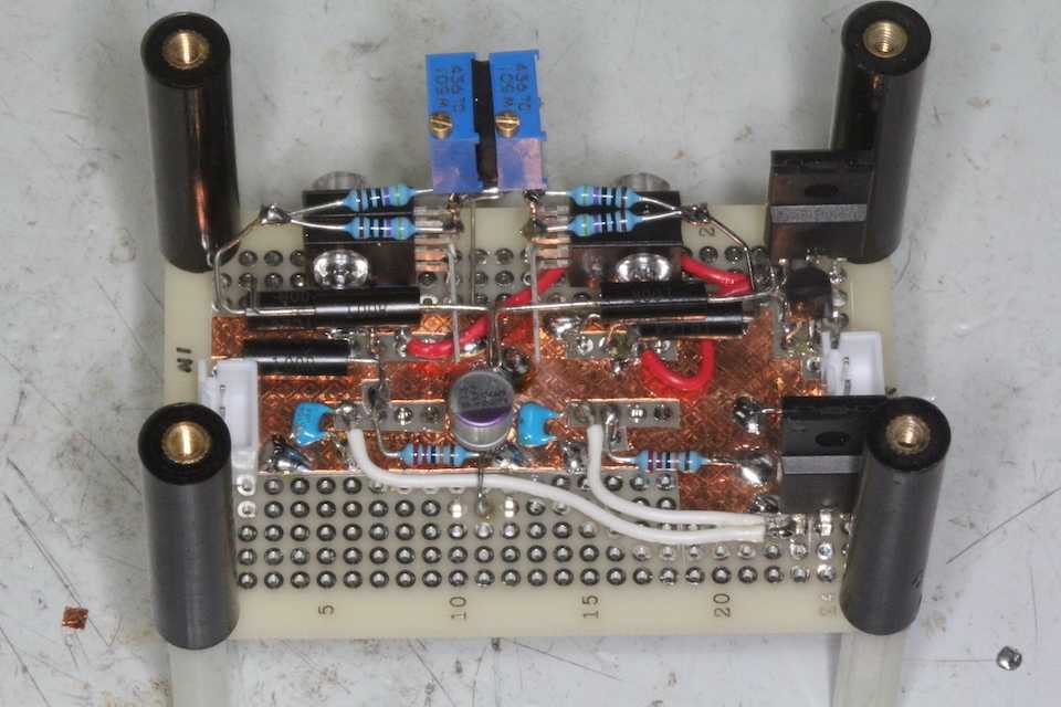 構造というのはどういうことかというと、部品配置ということだけれども、安易にプリント基板上に組み立てれば良いかと思っていたが、トンデモなかった。新作(前作)アンプが比較的すんなりいったのは、偶然にも大先生に作って差し上げたHS-400の定電流マルチ駆動用の4チャンネルアンプを作るに当たって1つの筐体に収めるためにコンパクトに作らざるを得なかったのだが、その構造をベースにしていたからだ。コンパクトに作るということは部品の足や配線材が最短になるということで、配線材の長さや電流の交差などの条件で大きく動作が不安定になる0.1Ω(普通のスピーカーは8Ω)負荷抵抗に数十Ap-pの電流が流れる大電流アンプには必要不可欠だということが実験機を作る段階で分かった。HS-400用定電流駆動4chアンプアンプ部拡大新作(前作)定電流駆動アンプ、回路規模が大きくなっている。これ以上の高密度構造は無理だと思う。一般的には出力トランスを使うしかないだろう。元祖ブラットハラー型スピーカーはそうだった。DC駆動は無理なのでMFBは使えないかもしれないが。この様に加工した基板を使っていた。