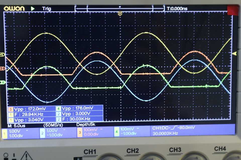 出力電流容量を増やすために、ドライバー回路をSEPPのバランス出力にしてみた。部品点数が3倍になってしまった。。まだ火入れはしていないが、ちょっとしたBTLパワーアンプの風情。ちょっとお昼寝の後、火入れしてみた。数MHzで発振していたので、ちょっと焦ったが対策したら綺麗な波形になった。300kHzまで歪みは見られず、1MHzまでは伸びている。入力:1.0Vp-p、周波数10kHz黄:マイナス側SEPPの負荷抵抗青:同プラス側赤:マイナス側コレクター緑:プラス側コレクターAB級動作になっている。この時のベース間電圧、バイポーラトランジスタのVbeは0.6Vくらいなので、プッシュプル回路だと2倍の1.2VでA級動作。0.5V×2を切るとB級動作になる。A級動作時、SEPPの出力端は電源電圧までフルスイングできる。バイアスを定電流で抑えると温度補償が要らないようだ。MOS-FETだけではくバイポーラトランジスターもだ。熱暴走しにくいのでこの点は設計が楽になる。定電圧駆動だと電流を抑える工夫が必要なのだが、定電流駆動だとそれが不要になる。考えてみれば当然かもしれない。定電流駆動アンプはオーバーオールのNFB(ネガティブフィードバック)を掛けられないので(掛けると定電圧駆動アンプになる)、見かけの諸特性を良くすることはできないが、オシロスコープで見た波形が綺麗なら音も綺麗という聴感と見た目が一致するというメリット(?)もある。定電流駆動というのはスピーカにとってもアンプにとっても理想なのかもしれない。A級動作時のSEPPのベース間電圧