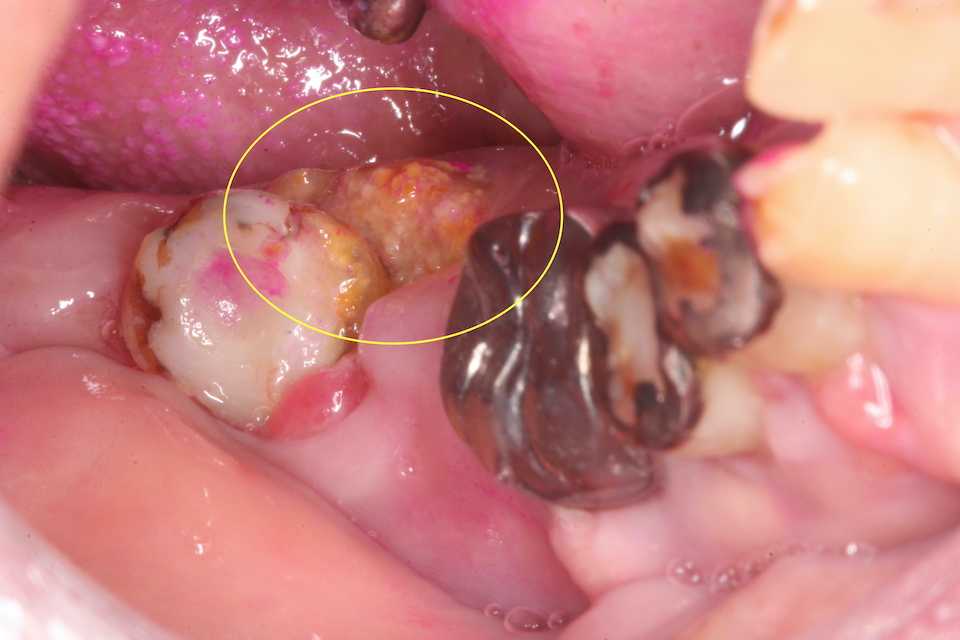 80代男性、前立腺癌、骨転移前回、前々回のつづきですので、遡って見てください。今回の症例で概ね主なビスホスホネート製剤投与の原因別の症例は網羅したと思います。前立腺癌のステージ4では骨転移するので、ボナロン等のビスホスホネート製剤の投与はするしかないのだと思う。口腔内清掃はSPTということで当院でも20年に渡って行ってきていたのだけれど、高齢化と共にフレイルは進み、歯磨きもちゃんとできなくなって感染しやすくなる。うちでも1ヶ月毎の口腔内清掃はPMTCとして保険算定できるが、維持療法となると毎週通院が必要になり当院では(も)対応が難しい。画像は粘膜がなくなり腐骨が剥き出しになっている状態。この後3ヶ月で亡くなった。