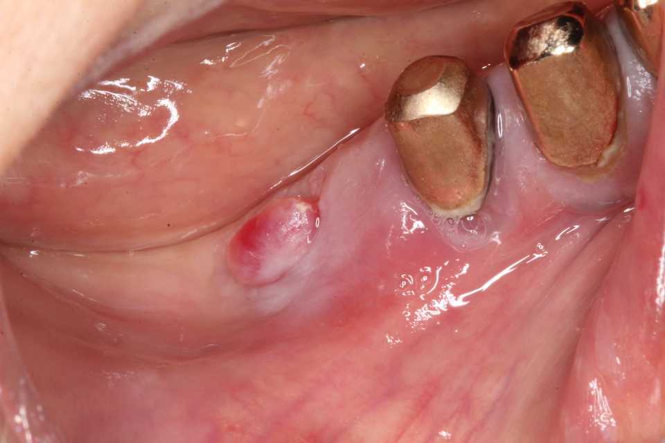 60代女性、薬剤性顎骨壊死前回も合わせて読んでいただきたいのですが、https://plaza.rakuten.co.jp/mabo400dc/diary/202508230001/この方の場合、目がおかしいということで大学病院でステロイドパルス療法(大量投与)を受けられた後、副作用の骨密度の低下で脊髄骨の圧迫骨折。ビスホスホネート製剤の投与を受けられ、腐骨を形成してしまった。直接の原因は極端に熱い食べ物が好きで粘膜の火傷を繰り返すことにより顎骨に感染が広がったということの様です。これが見た目の腐骨の直上の粘膜の状態で、接触痛はある様ですが、自発痛はないということでした。かかりつけの?大学病院の口腔外科で残存歯は全て抜歯になった。元々歯根が短く動揺度は1〜3と大きかったので、感染しやすいと判断されたのだろう。腐骨除去+抜歯後欠損部を口腔内で作り、義歯を再利用している。