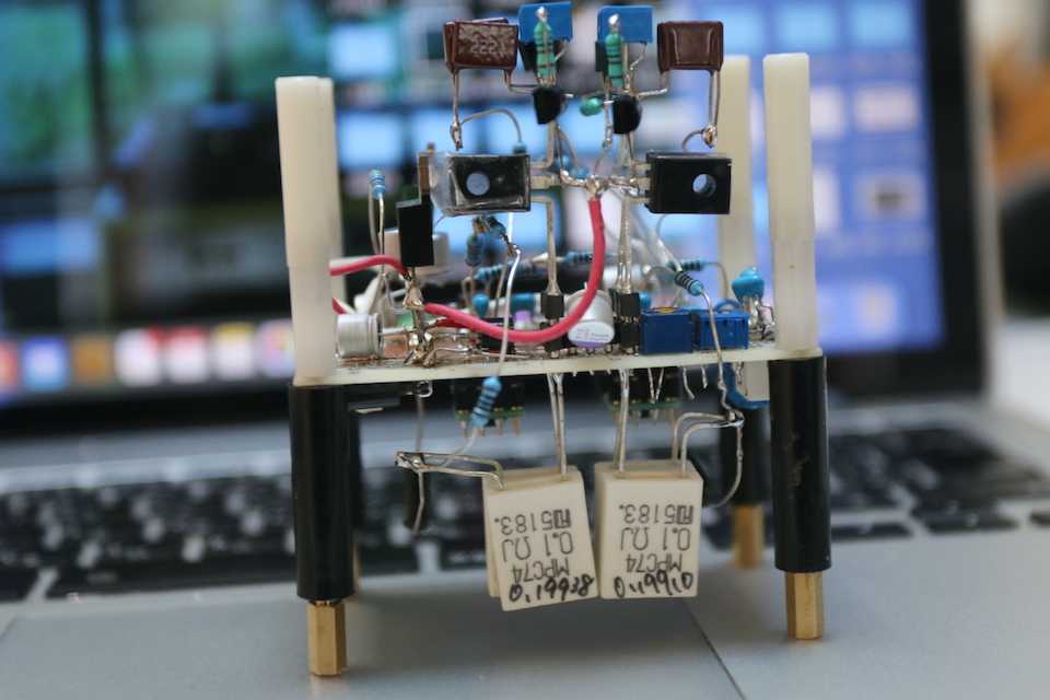 試作機というより実機を目指しているのだが、組み立てが結構難しい。結局空中配線のオバケになりそう。まだできていないのだが、奥の方から積み上げる形で組み上げていくしかない。僕がやっている「ストリップスを使わない隣接面CRシリーズ」と同じでしかない。というか、やっている人間が同一人物だから仕方がない。あれから頑張って組み立てた。後は動作確認予定。オバケというほどでもないが、高精度抵抗のサイズが大きいので高密度化して見える。組み上がった初段+ドライバー基板に火を入れてみた。コンプリメンタリーPP(プッシュプル)のバイアス電流がA級の200mA流れていてTrがチンチンになって焦ったが、動作確認できた。Vin:1Vp-p、10kHz、AB級に調整。方形波も見てみた。ちょっとだけオーバーシュートが見える。位相補正が足りないようだが、これくらいの方が音が良いことが多い。C-in/out:100pF。40mA程の動作電流ファイナル段を繋いで調整してみた。動作を確認した。1.0Vp-p入力、赤が0.1Ω負荷の出力電圧波形
