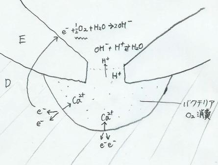 つまりO2濃度の低い虫歯の内部からe-を奪う、