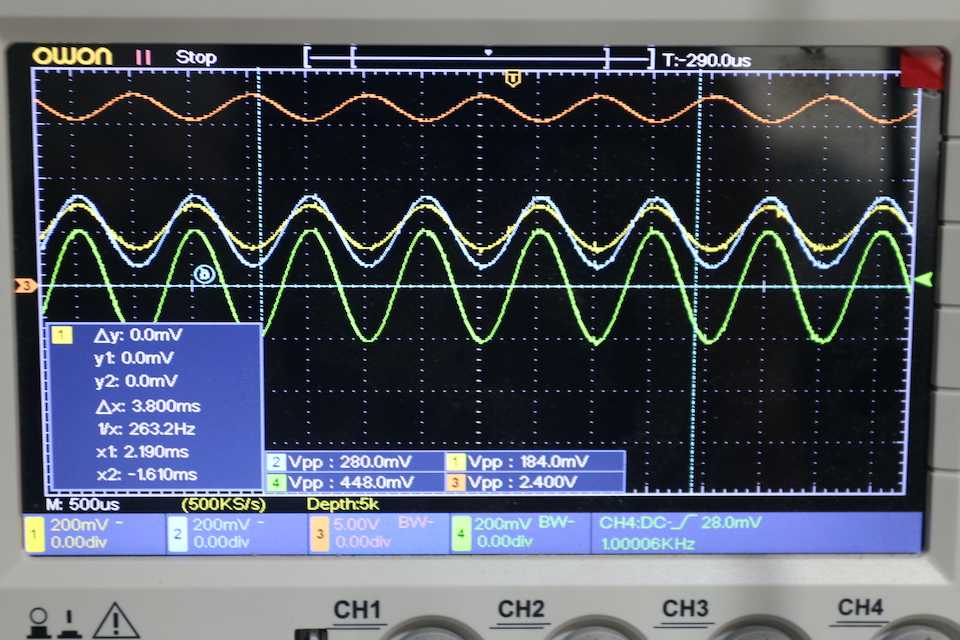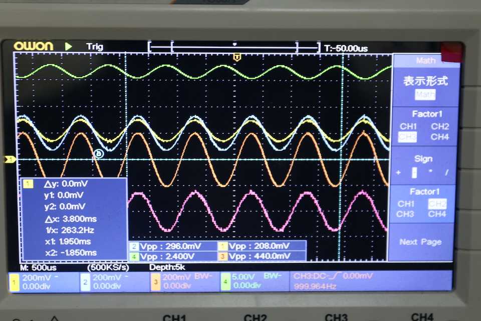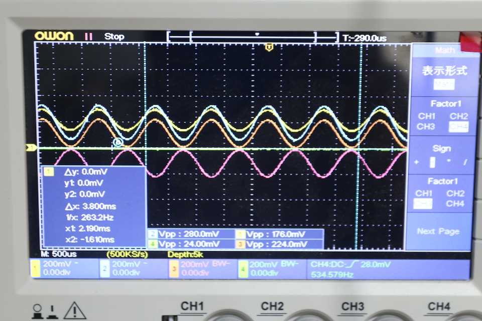 左側、共通ソース電位(オレンジ3ch)、赤(差信号)は入力:緑ー共通ソース:オレンジ