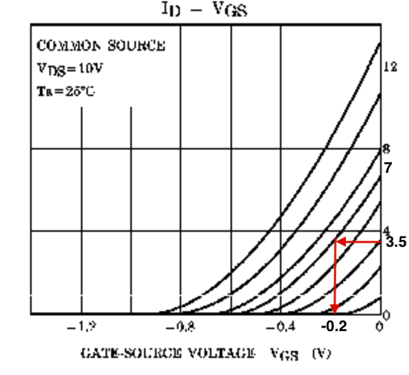 今回の2SK117BLのIdssは7mAを選別して使っているので、図のY軸の8と書いてあるところより少し下の曲線上の話になる。動作Idは3.5mAに選んでいるので、その時のVgsは-0.2V程度になる。