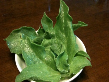 前から気になっていたんですが、昨日ついに食べてみました。アイスプラント。はっぱに水滴に見えるブツブツした物体がちなみに、買ったのは登米市の産直市場。他の産直市場でもたまに目にしていたのですが、登米市のはとても新鮮に見えて・・・ついに購入決定!先ずは生でパクリ。意外としゃきしゃきして噛み応えバッチリ!ドレッシングでパクリ。うーん。好みが分かれると思うが洋ドレッシングと合うかも。葉っぱがしょっぱいせいか、結構食が進む。見た目にも不思議な野菜。食べても不思議。なんでしょっぱいんだろうねぇ?