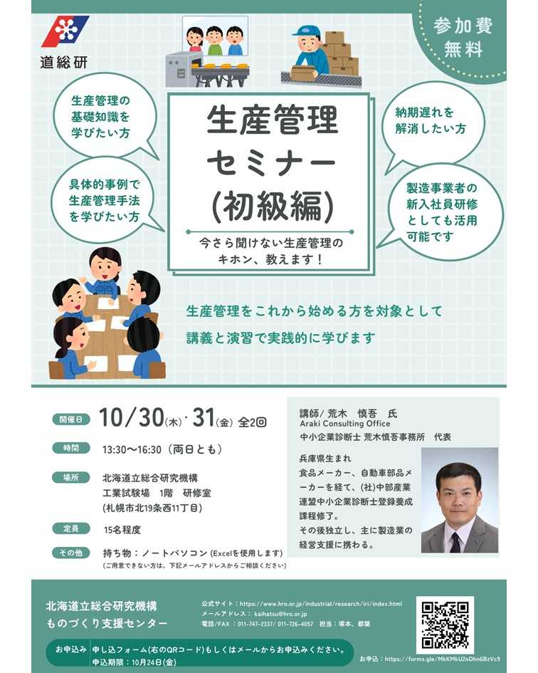 道総研産業技術環境研究本部 ものづくり支援センターでは、生産管理をこれから始める方を対象に、生産管理の基本を講義と演習により実践的に学べるセミナーを開催いたします。