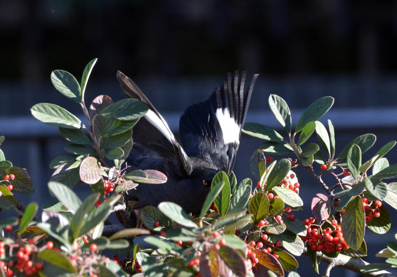 街川散歩ハッカチョウですなゴジラのような目つきは相変わらずですお食事です飲みこむにはこんな風に一回ひょいとして喉の奥に落とし込みますなヒヨドリなどみな同じようにして食しております鳥たちの食欲は旺盛でピラカンサの実は日に日になくなっていくのでござりまする