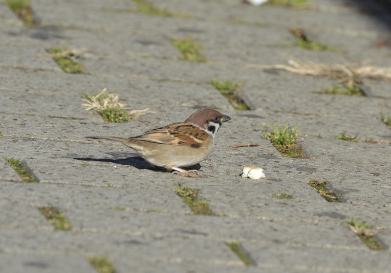 街川散歩おっスズメ君「なにしてんのぉ」「えっ」・・・と振り向けばお食事中でしたな「そうなの お 食 事 中 だ よ」ずいぶんとお口の周りに付けてますなクチバシも濡れてないようですしなぜにそんなにくっついているのでしょうかなふむ口で揉んでぷっとする殻が付いているのでしょうなスズメ君黙々とたべていたのでござりまする