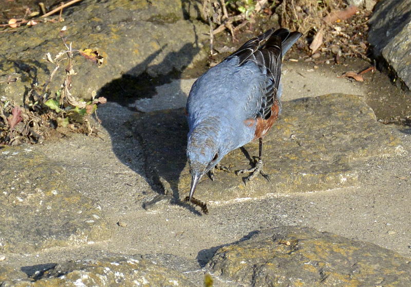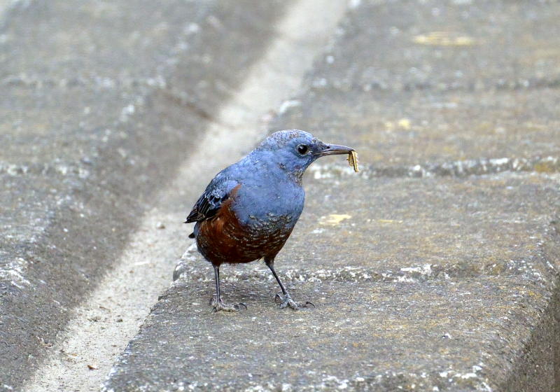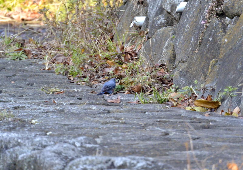街川散歩街川にもようやくイソヒヨドリの雄が現れましたな少々興奮しとりますメスには毎年会うのですがどうしてもオスには会えませんでしたメスがいるならオスもいるのが道理ですがこれがなかなか会えないのですなそんなことでしたから今年はさい先がよろしいようでございますということでイソヒヨドリ君 「その一」ですな咥えているのは芋虫君ですな咥えたり放したりしてからお腹に納めますな孫と一緒だったのが功を奏しているのかこのあとしばらく道教えのように二人の目の前で餌捕りを見せてくれましたじっと藪を見ていると思えばぴょんと藪に頭を突っ込みましてもどると芋虫君を咥えています川の両岸を行ったり来たり孫もそっと歩を進めますがイソヒヨドリ君はつかず離れず餌探しを見せてくれました・・・それにしてもキレイな色合いで写真でうまいこと再現できていないのが少々残念なのでござりまする