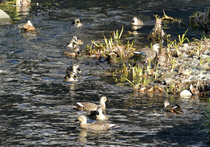 街川散歩街川では珍しい光景です絵の中には12羽のカルガモ君右手の陸に3羽いまして都合15羽・・・三渓園や鎌倉では数え切れないほどのカモ類が池に群れていますが街川で群れるとは画面上に眼を転じればおやまぁヒーフーミーヨー・・・7羽いますなコサギ君も混ざれば全部で23羽です見れば川面にパンくずを投げているお方がいましたなどうやらそれを目当てに集まってきたようです。いまどき水草も乏しいのでカモ伝に聞いて集まってきたのでしょうこれまでも餌を投げる人はいるのですがこれほど集まったのを見たことがありませんな盛況盛況・・・盛況なのでござりまする