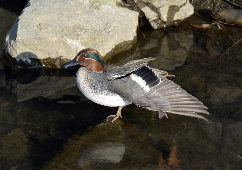 街川散歩コガモ君が日光浴です伸びをしてますなカルガモ君と一緒で次列風切りがキレイですなたたむとこんな感じですん・・・なんだか変ですなパタパタしまして・・・たたみますとあら不思議・・・でもないですがいつものコガモ君になりました。巧いこと出来てますなコガモ君はここ最近けっこう動きがあります眠そうにしていた時期は過ぎまして活発にお食事に励んでいますないないときもありますから遠征もしているのでしょうな渡りの開始にあと二月三月です・・・そう考えればあっという間に春が来そうですが・・・ちょいと気が早やいのでござりまする
