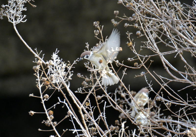 街川散歩サルスベリの種を求めてスズメ君達が集いますなそろそろ種も尽きてきています種を食すには細い小枝に留まらねばなりません足場が少々悪いのですなようよう留まりましたお食事開始ですサルスベリの実はくす玉のように割れてますそこから種を取り出して食べますな不思議といつも見るのはスズメ君ばかりでほかの鳥が食しているのは見たことがありませんまぁ遭遇していないだけかも知れませんな枝上でふらふらとしながらも一心に食事をしているのでござりまする