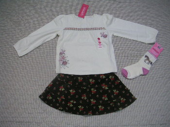 22日にHOLIDAY25%引きで注文したGYMが届きました。すべて新作Winter Princessからです。ボーダーのにしてみました。サイズは丈が短いと嫌なので5-6にしてみましたが、あいあいでも大きすぎという感じではなく大丈夫でした。このボーダーなら男の子でも大丈夫だと思います。なのでゆうゆうと二人で使えそうです。生地は薄目のフリースですが陽がでている日などには使えそうな感じです。サイズは2Tです。やはり生地は薄目です。フードなどがついているのでワンピースとしては着づらいかも?なのでアウターにしようかな?と思うけど薄いし。。中に暖かい格好をさせてアウターとして着せようかな?服に比べ小さい袋だったんのでクシャクシャだったのが残念。 KGのワンピなので、サイズは3です。来年用に買ったのですが思ったより大きくはないみたいなので、春に着れるかな?と思います。生地は薄いのでもともと真冬は無理そうなワンピースなので大きい方がちょうどいいと思います。裾のフリフリがとってもおしゃれでかわいいです。色はRGのJSKとほぼ同じ色でした。右側の写真は色を比べてみたものです。JSKはBGのみなので3T、トップスは3です。このトップスと同じ柄のボディースーツとコーデュネートされていたのでJSKとあわせようと買いました。でもこの小花柄とってもかわいいです。おまけみたいな感じで買ったのですが、これはツボでした。JSKはとっても細いです。丈も約52cmなのでいつも2Tを着用しているのですがかわらないような感じです。でも本当に細すぎでびっくり!! あとはトップス&ボトムス類です。右側のAライントップスはとってもかわいくってお勧めです。KGのスカートとあわせるつもりです。このスカート、JSKと同じピンクのコーデュロイなのですがラメが入っていてキラキラしています。UPにしてみましたがわかりづらいかな?でも生地は薄いので春用かなと思います。全体的に色が上品でとてもきれいでした。やはり届いたのをみるとツボすぎてもっと欲しいラインです。