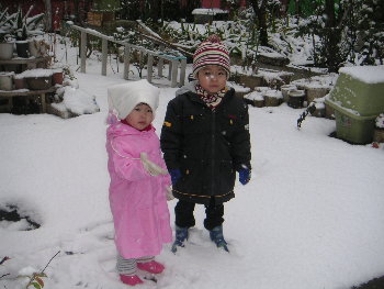 今日は目が覚めたら雪が降っていました。初雪です。ゆうゆうは天気予報を見て木曜日からずっと雪を楽しみにしていたので朝から大興奮でした(^^)私は寒くて外に出たくはなかったのですが、子供達二人は朝から「外に出て遊びた~い」と大騒ぎ!!仕方なくお昼頃まだ雪が降っているのに庭で一緒に遊びました。 二人とも雪のことをわたあめだ~と言ってご機嫌で遊んでいました。道路にはあまり積もっていませんでしたが、庭には結構積もっていました。小さいですが雪だるまも作ってみました。 これ撮ったあと二人してキックして壊していました(・・;子供達は明日も遊ぶんだと張り切っています♪しかし夜ゆうゆうは頭を切ってしまいました(><)ふざけて後ろに倒れたら机の角に頭をぶつけてしまいました。血がたくさん出てティッシュで抑えたのですが間に合わず手までぐっしょりついてしまいあせったのですが5分くらいで止まりました。なのでお医者さんには行かず義母が持ってきてくれた薬をつけバンドエイドをしてプールの帽子をネットがわりに被っています。あれから4時間くらいたちましたが大丈夫なようです。実は私も幼稚園の時に後頭部を切って縫ったのです。親子揃ってとならずによかったです。