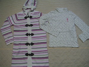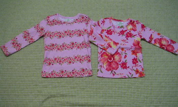 12日に還元で注文したGYMのお洋服が届きました。今回は新作中心のオーダーなので数は少ないですが、みんなかわいいので大満足です。Freshly Picked からワンピース2点、どちらも3Tです。サイトで見たよりも落ち着いた色に感じます。丈は肩の一番高い部分から55cm、首の部分から50cmでした。オレンジのワンピはTシャツ地なので着易そうです。裾のフリルがとってもかわいいです。デイジーワンピーはサラッとしたブラウス地のような感じで、ちゃんと裏地がついているので透ける心配はなさそうです。思ったより落ち着いた感じなのであいあいでも大丈夫だろうと思います。 トップス3点が4&4T、バイクショーツが3です。こちらも落ち着いた色のように感じます。Aラインの2点は他のに比べ同じサイズでもやはり大きかったです。バイクショーツは去年もお気に入りでたくさん着せたのでオーダーしました。カラフルでとってもかわいいです。Calypso から トップス3点が4、デニムが2、スカートが3になります。真ん中のトップスはどうしようか悩んで注文したものなのですが、スパンコールがついていてとってもきれいでです。3点ともかわいくって気に入っていますが、この真ん中のが1番気に入りました。ジーンズはウエストがアジャスターゴムなので便利です。サイズは2Tで股下は25cm(アンクル丈です)になります。生地はやわらかいので、履き心地はよさそうです。このジーンズはFreshly Pickedのコーディネートにもあったとおり、Freshly PickedにもCalypsにも合うので重宝しそうです。スカートは3Tで32cmと丈が長いです。2Tでもよかったかなと思いました。生地は薄いですが、こちらも裏地がちゃんとついているので透けないです。Tyrolean Lure &Sweetheartから 私用のポンチョとリバーシブルヘッドスカーフです。ポンチョは家の中でちょこっと羽織るものが欲しいなと思っていたら、安かったので買ってみました。デザインもかわいくとても暖かそうです。ヘッドスカーフはCalypsoのお洋服に合うかなと思い買ってみました。いろいろとあわせやすそうな色なのでよかったです。以上13点です。箱を開けたら春を通り越して夏という気分になりました。早く暖かくなってたくさん着せたいと思ってしまいました。またセールになったら少し買い足したいなと思います。ちなみに間違って入っていたのはこちら↓の2点です。 英語のやり取りを思うと面倒です(><)