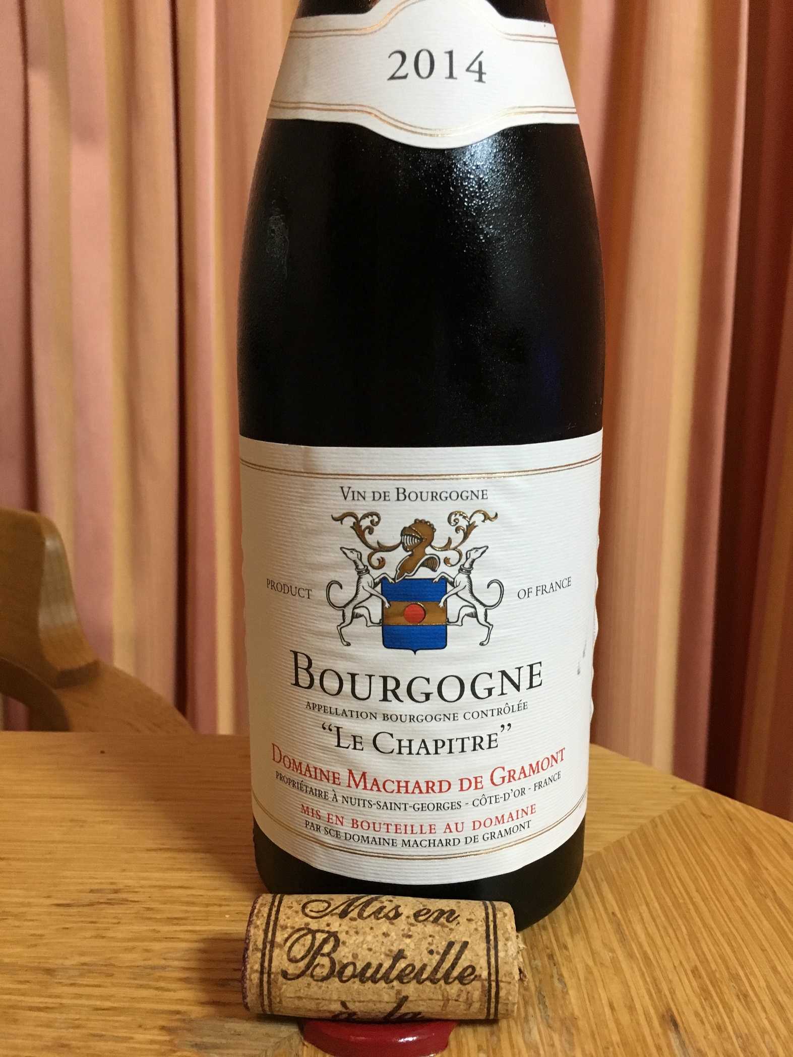 マーシャル・ド・グラモンの畑名付ブルゴーニュです。このシャピトルという区画はマルサネの北、シュノーブル村にあり、フィロキセラ前は銘醸畑として扱われていたようです。そういった経緯から、現在でもポテンシャルの高い特別な区画として、ルイ・ジャド、ジャン・イヴ・ビゾ、シルヴァン・パタイユ、マーシャル・ド・グラモンなどの所有者が「シャピトル」として醸造・瓶詰めしています。なお、仮に昇格しようとした場合マルサネのヴィラージュに含まれてしまうなど、「シャピトル」を名乗れない可能性があることから、敢えてACブルゴーニュにあって、「シャピトル」と名乗ることを尊重しているようです。前置きが長くなってすみません。お盆に虎ノ門を散策していた際、某ワインショップでこのワインを見つけ、持ち帰ってから1週間ほど経ったので開けてみることにしました。カシス、ブルーベリー、クランベリー、スパイス、ザクロ、スパイスなどの芳しい香り、ふっくらとした黒い果実、シャキシャキとした感触、柔らかめの酸、濃すぎず薄すぎず純朴さもあって、グラスの中で開いてきて、透明な可憐さも出てきました。杯がスイスイと進みますね。香り味わいともちょうどよく開いていて、柔らかくて、ほどよいミネラル感もあって、良いタイミングで飲むことができました。上位の格付けに匹敵するかと問われると、正直なところ、今回だけではなんとも言えませんが、飲み応えはそこそこあるのかなとは思います。一度だけ、ビゾのブルゴーニュ・シャピトル(08だったと思います)を飲んだことがあるのですが、その時には構成感やポテンシャル等の迫力も感じましたが・・・。ただし、このマーシャル・ド・グラモンの価格はビゾの1/5(約2k)ほどであり、単純には比べられないとも感じています。薀蓄はさておき、ここのワイン初めて飲みましたが、派手さはないものの、比較的純朴で魅力的なピノだと思います。他のビラージュや1級等も是非飲んでみたいと感じました。(1級のレ・ゴーディショはおいそれと飲めそうにありませんが^^)素敵なひとときを楽しませていただきました。2016年8月 虎ノ門 カーヴ・ド・リラックス で購入