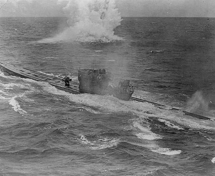 連合軍の爆撃を受けるドイツ海軍潜水艦U-848(タイプIXD)。U-848は日本海軍の支援の元、インド洋で活動するドイツ海軍潜水艦部隊のモンスーン戦隊に合流するためブラジル沖を航行中だった。*以外の一連の写真は1943年11月5日の撮影とされる。一番下写真・前の一弾は着弾し、水柱を上げている。命中はしていないが、水中爆発の圧力により船体は被害を受けていると思われる。艦船にとって至近弾による水中爆発は魚雷と似たような被害を与えるという。Uボートの外殻の鉄板の厚さは20ミリしかない。もう一発が水面に着弾しようとしている。Uボートは面舵をとり回避運動中だが、的確な爆撃に殆ど効果がないようだ。U-848はこの後沈没し、乗員63名全員が戦死した。*右はIX型Uボート、左はVII型