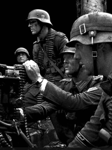 グロースドイッチュラント師団のMG42とそのクルー。1942年7月東部戦線ヴォロネジ市での撮影とされる。兵士たちの真剣な表情から戦闘の緊迫感が伝わってくる。武装親衛隊は腕賞を左袖に着用していたが、グロースドイッチュラント師団では陸軍の部隊であることを示すため右袖に腕賞を着用していた。ドラゴン 1/6 WW.II ドイツ MG42機関銃 w/専用三脚?(ラフェッテ) DR75017タミヤ【プラモデル】1/35 ミリタリーミニチュアシリーズ No.386 ドイツ機関銃チーム (大戦中期) H-4950344353866【35386】