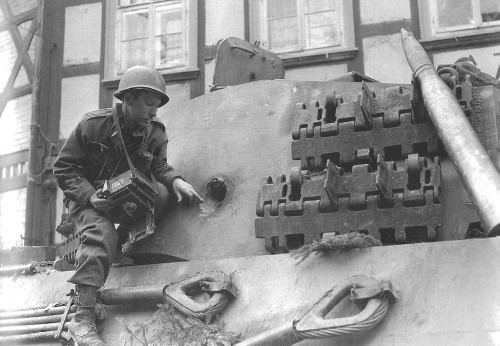 ティーガー2の砲塔側面の貫徹痕。不気味に穴が開いている。90ミリクラスの砲弾痕だろうか。脇に置かれている砲弾は、このティーガー2の88ミリL/71の徹甲弾と思われる。M36やM26パーシングに搭載されたTシリーズ50口径90ミリ戦車砲は、砲口初速1020m~820mの各種砲弾があるが、パンターやティーガーの側面装甲に対しては充分な威力を持っていた。T15E1砲弾(HVA弾)を使用した場合、距離900メートル傾斜30度で220ミリの装甲を貫徹したという。前面装甲を打ち抜かれたティーガー2は一輌もないというが、市街地で前面の重装甲を生かせず近距離から側面をまともに撃たれればこの様になるのだろう。今年は私的には大切な人と死別するということがあった。この写真のティーガー2の乗員も亡くなった方がいるかもしれない、冥福を祈りたいと思う。